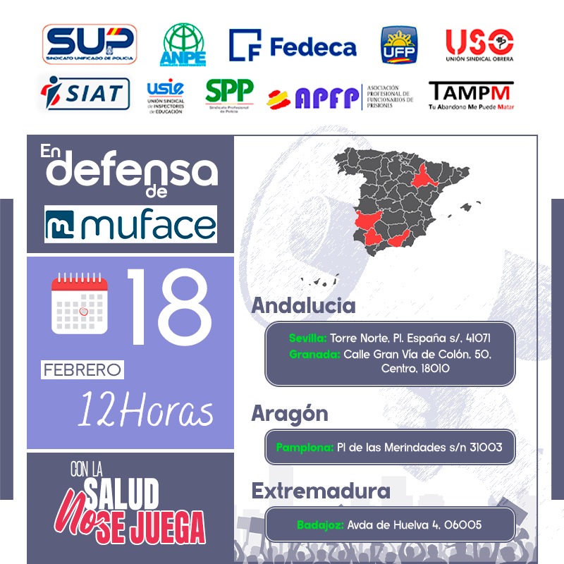 Hoy en Granada, Sevilla, Badajoz y Pamplona hemos exigido una solución rápida para los miles de funcionarios cuya atención sanitaria depende de MUFACE. #ConLaSaludNoSeJuega En breve, la...