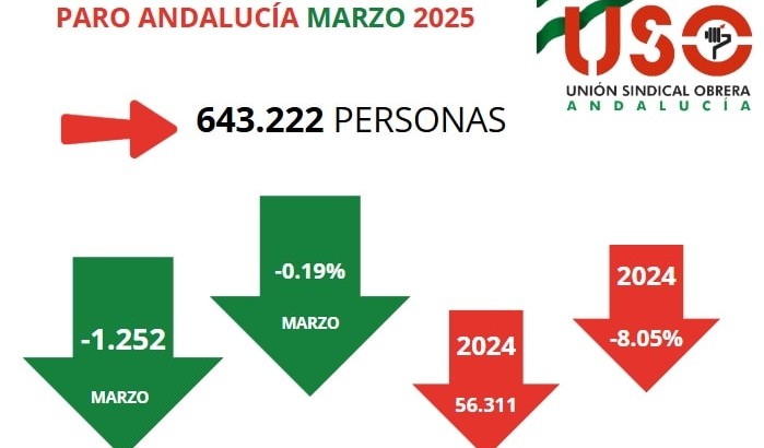 En marzo de 2025, el desempleo en Andalucía descendió en 1.252 personas (-0,19%), alcanzando la cifra más baja para este mes desde 2008, con un total de 643.222 desempleados. Este descenso fue liderado por el sector servicios, que registró una reducción de 2.928 parados (-0,66%), consolidando la tendencia positiva en la región. Sin embargo, el paro aumentó en los sectores de agricultura y pesca (+0,38%, con 139 personas más) y en el colectivo sin empleo anterior (+2,21%, con 1.659 personas más), indica Jesús Payán, Secretario de Acción Sindical y Empleo de USO Andalucía.